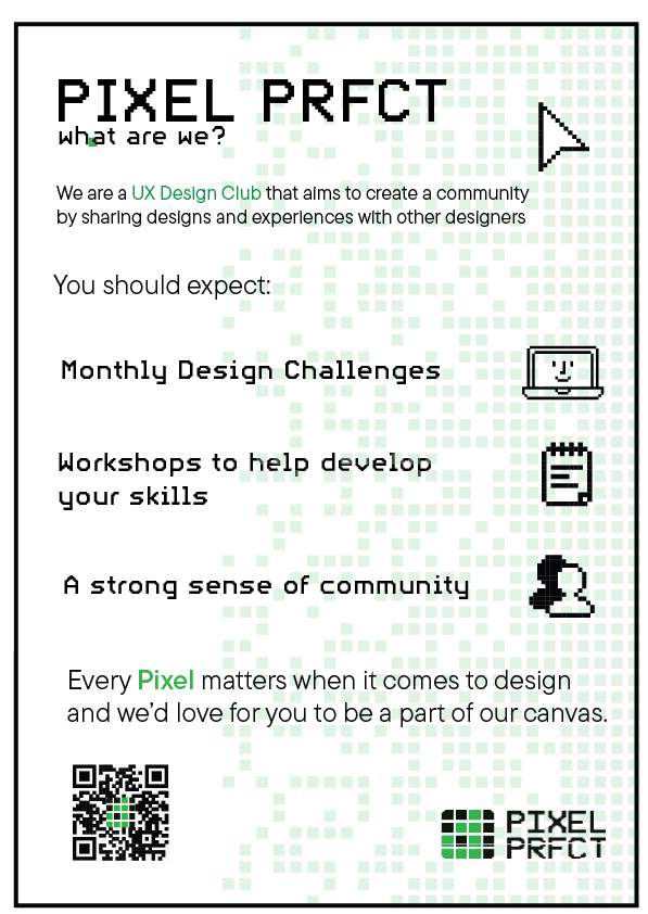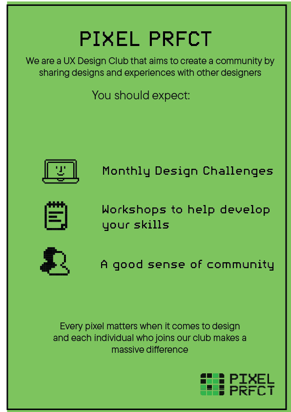 After some feedback from peers and doing a coworking session to make some more tweaks and adjustments, I eventually landed on this design. The text in the middle and in the headings was adjusted to be a bit more stylized to be a retro-like aesthetic, really sticking with the idea of pixels. The background was changed to include the background pixels in a less crowded way that still draws eyes.