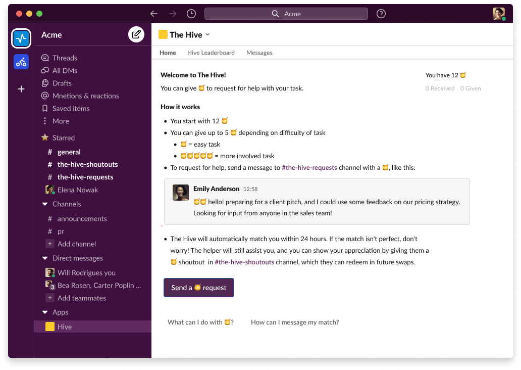 The idea is based around a system where you start with a set amount of “honey”; you can use honey to request a specific skill you need someone to assist you with, and in return for helping you with the task, the person earns honey to use themselves. It creates initiative to not only ask others for help, but to collaborate with others; benefiting both sides instead of coming off like a one-sided interaction.
