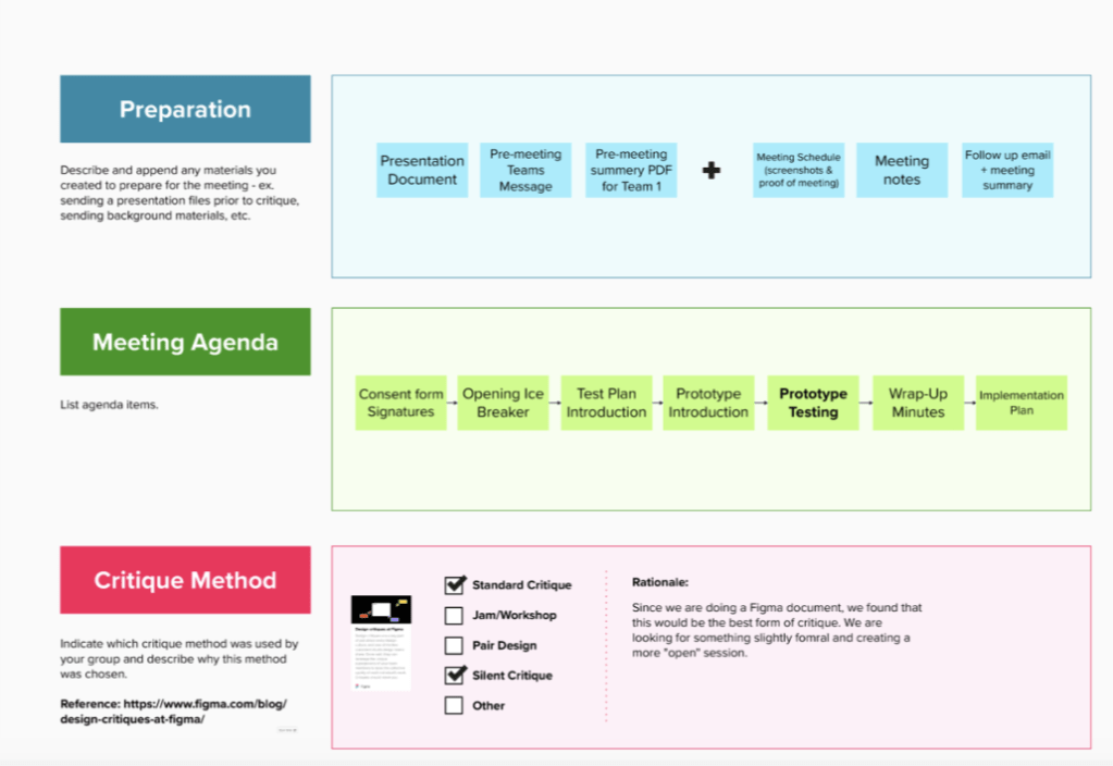 For our main testing, the group had 1 participant participate in a one – on – one think aloud session, where the participant is asked to perform specific tasks on the prototype while speaking through their process navigating the program, saying what they think they should do and any points of confusion they come across. The remainder of the participants did silent testing, where instead of speaking out loud they were asked to place notes on the parts of the prototype they felt were confusing or think needed further clarification. 2 of the group members were responsible for administering and giving instructions for the testing itself while the other 2 members wrote down notes and observations based on feedback from the participants.